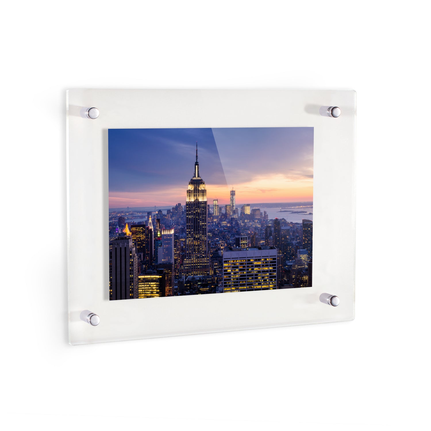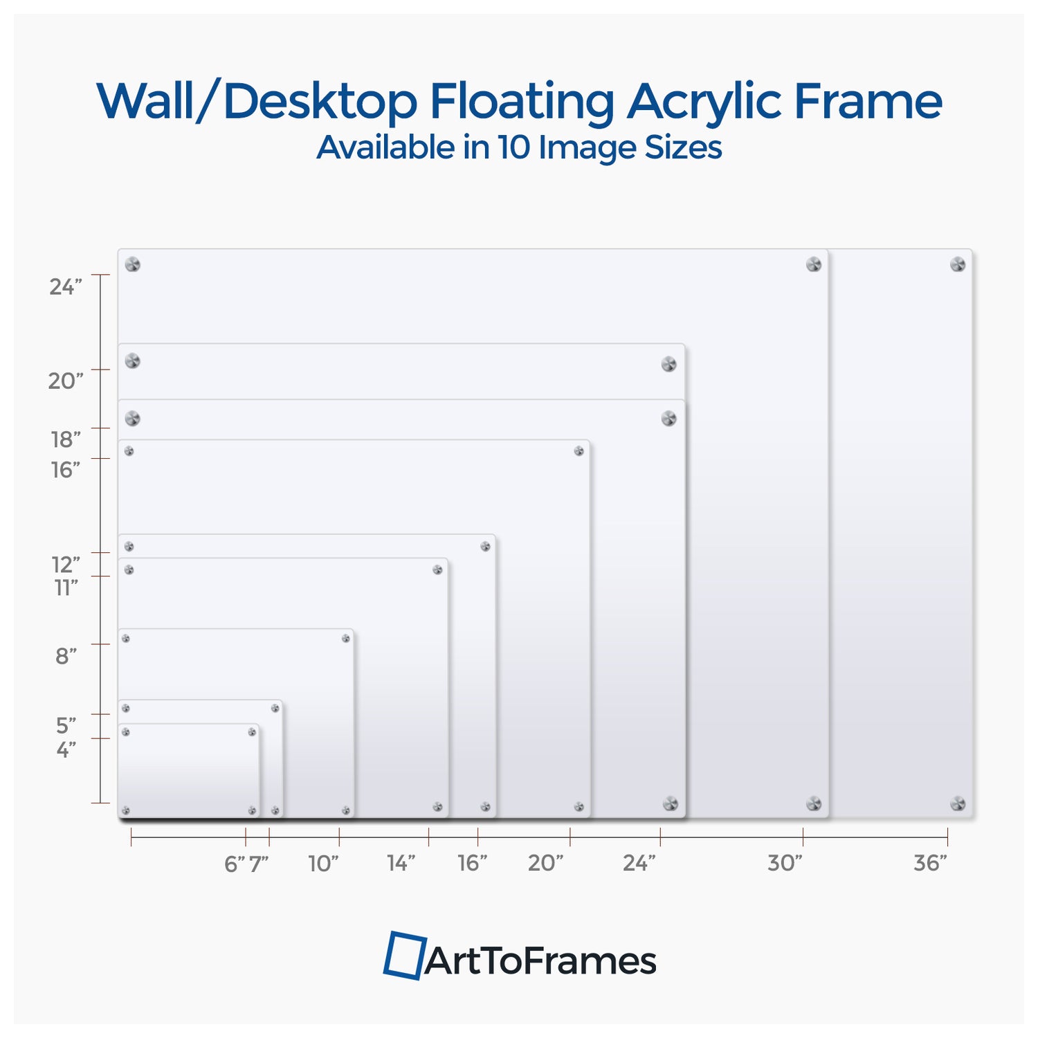 | Frame your pictures or artwork between two panels of acrylic. The full acrylic frame is 15x18 and is ideal for pictures up to 11x14 . You can easily update your picture by unscrewing the caps of the standoff mounts and removing the top layer of acrylic and mounting your picture or art using a small piece of double sided tape. Comes in multiple sizes from 5x7 up to 24x36 and in 5 different colors. Made in The USA. |